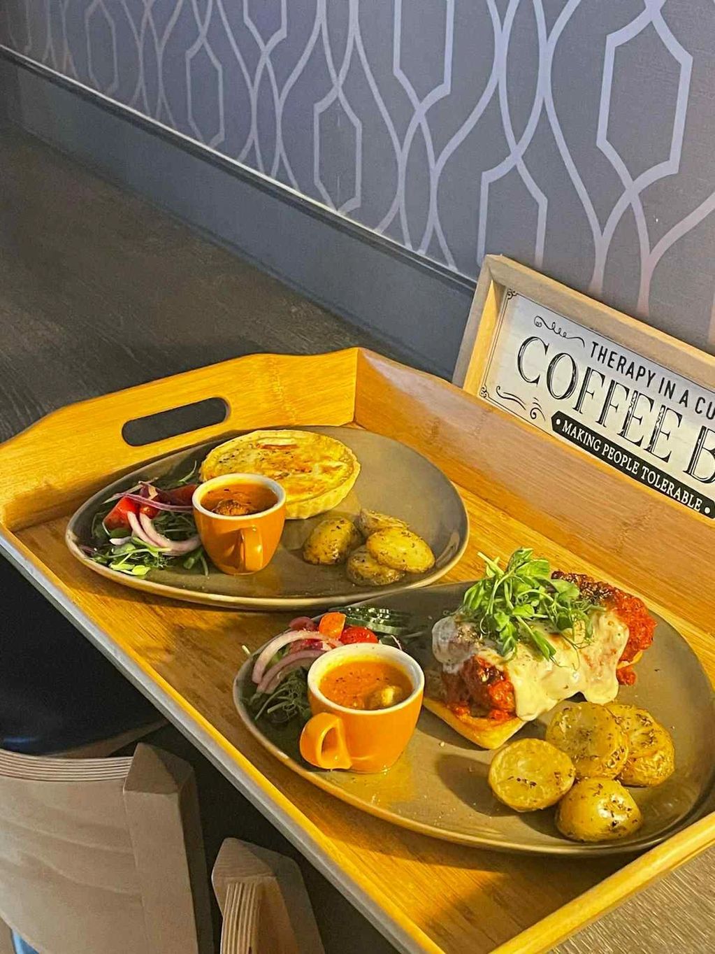 Both served with herby scalloped potatoes, salad garnish and a small cup of the soup of the day.