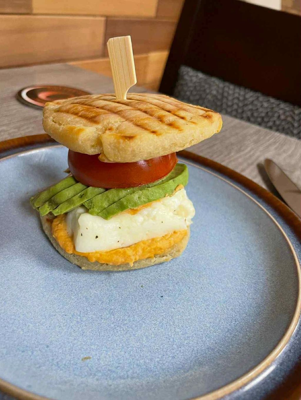 Red pepper hummous, Grilled Halloumi, Sliced Avocado and Tomato.